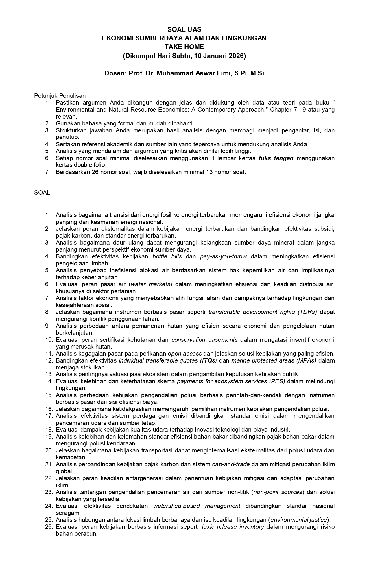 Academic Ekonomi Sumberdaya Alam dan Lingkungan Semester Gasal Tahun 2025 January 8, 2026January 8, 2026 As Tugas dan Jawaban UAS di Upload di Link https://forms.gle/vBYb4osPfHC3JTQZ6 Download Buku di Link: Environmental and Natural Resource Economics | 11th Edition 1 file(s) 8.1 MB Download