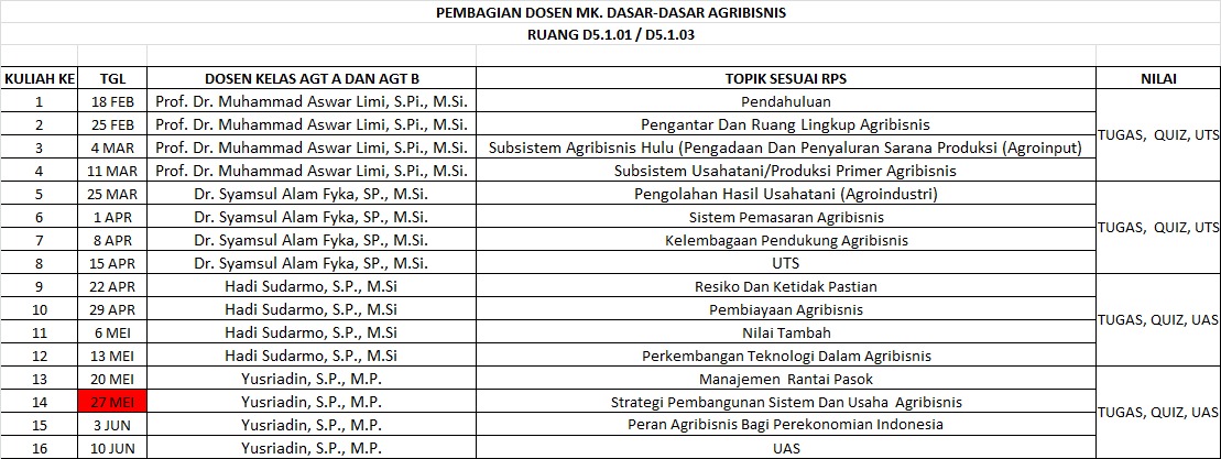 Mata Kuliah Dasar-Dasar Agribisnis Semester Genap 2025.2 – AGT A dan AGT B