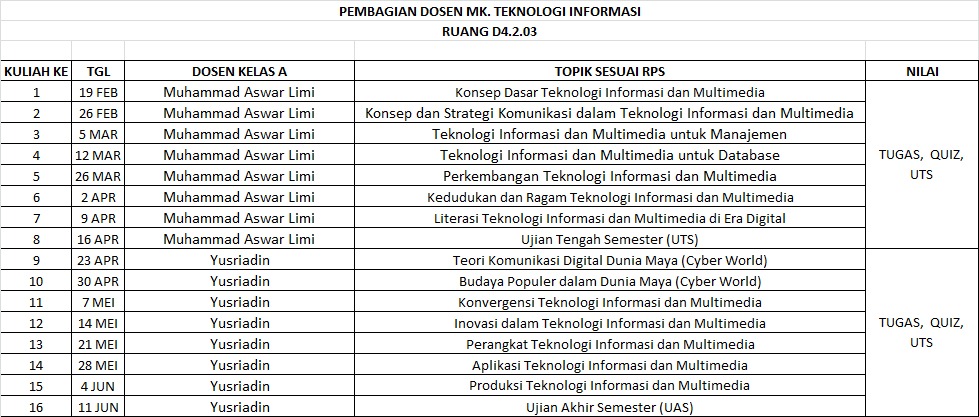 Academic Announcement Mata Kuliah Teknologi Informasi Semester Genap 2025.2 – AGB March 24, 2026March 24, 2026 As Mata Kuliah: Teknologi Informasi (2-0) Dosen: Prof. Dr. Muhammad Aswar Limi, S.Pi., M.Si. Yusriadin, S.P., M.P. +62 853-9473-1532 RPS RPS Mata Kuliah Teknologi Informasi 1 file(s) 1 Download Pembagian Dosen Mengajar Referensi Information Technology Project Management Revised 6e 1 file(s) 1 Download Information Technology Project Management 1 file(s) 1 Download Information Technology 1 file(s) 1 Download Information Technology Auditing 3rd-edition 1 file(s) 1 Download Information Technology and Product Development 1 file(s) 1 Download Information Technology and Societal Development 1 file(s) 1 Download